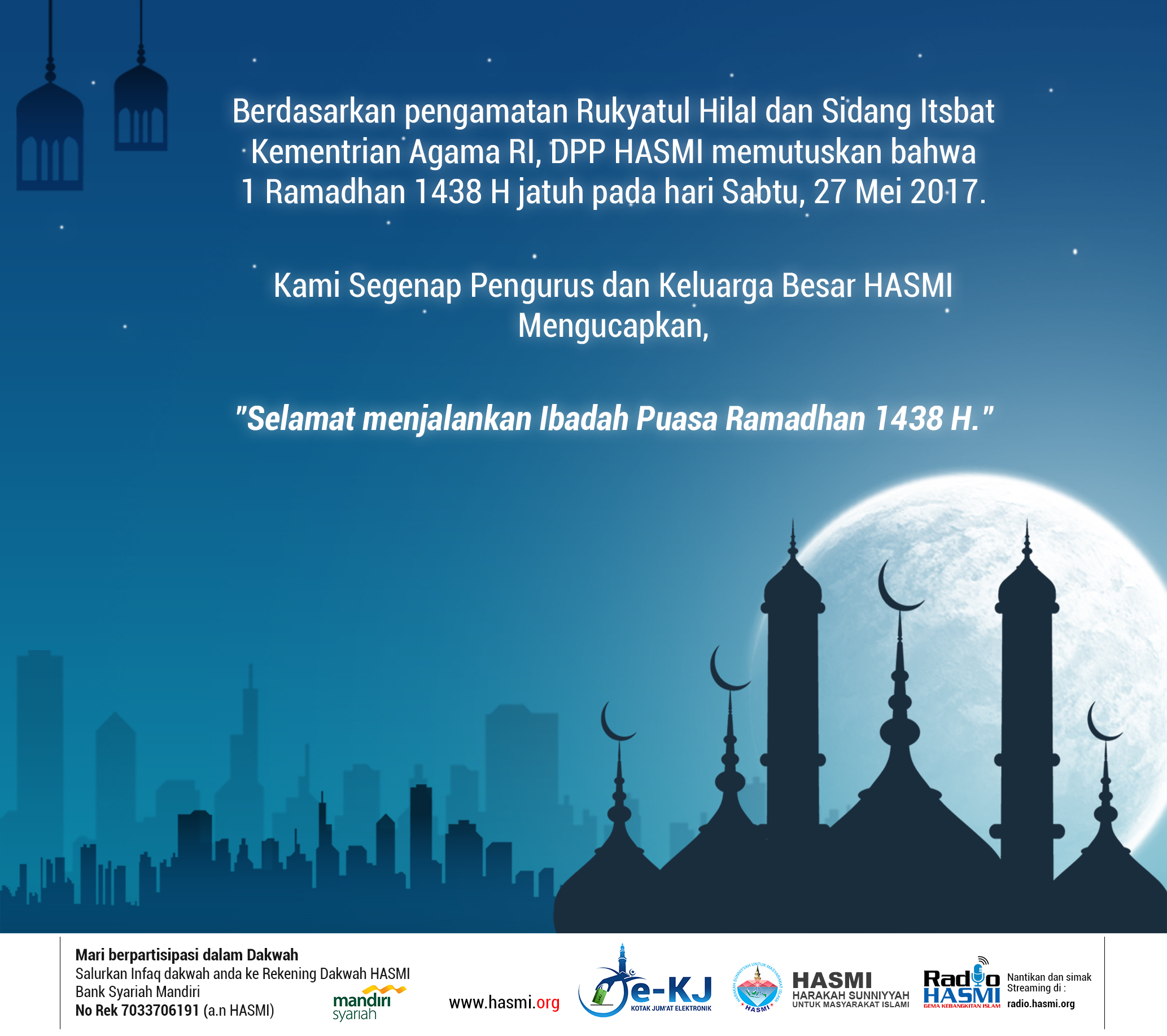 KEPUTUSAN DEWAN PENGURUS PUSAT HARAKAH SUNNIYYAH UNTUK MASYARAKAT ISLAMI NO: 090/KEP/DPP-HASMI/V/2017 Tentang Keputusan Penentuan Awal Romadon 1438 H./ 2017 M. Mengacu: Kepada dasar kewajiban pelaksanaan puasa Romadon dalam Al-Qur’an Surat Al-Baqoroh Ayat 183: يَا أَيُّهَا الَّذِينَ آمَنُوا كُتِبَ عَلَيْكُمُ الصِّيَامُ كَمَا كُتِبَ عَلَى الَّذِينَ مِنْ قَبْلِكُمْ لَعَلَّكُمْ تَتَّقُونَ “Hai orang-orang yang beriman, diwajibkan atas kalian berpuasa sebagaimana diwajibkan atas orang-orang …