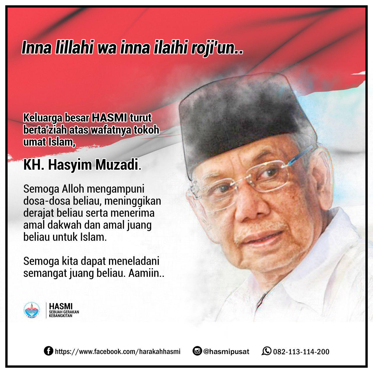 KELUARGA BESAR HASMI (Harakah Sunniyyah Untuk Masyarakat Islami) Turut berta’ziah atas wafatnya Tokoh Umat Islam “KH. HASYIM MUZADI” Semoga Alloh subhanahu wata’ala mengampuni dosa-dosa Beliau, Meninggikan derajat Beliau, Serta menerima amal dakwah, dan Amal juang Beliau untuk Islam. Semoga kita dapat meneladani SEMANGAT JUANG Beliau..!!