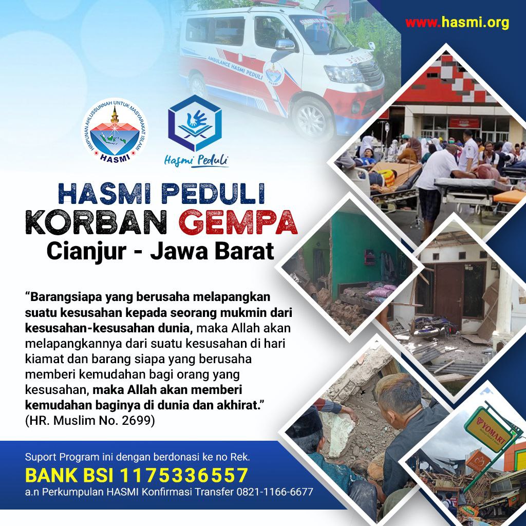 Oleh sebab itu kami dari HASMI Himpunan Ahlussnunnah Untuk Masyarakat Islami membuka penggalangan dana untuk para korban gempa Cianjur-Jawa Barat