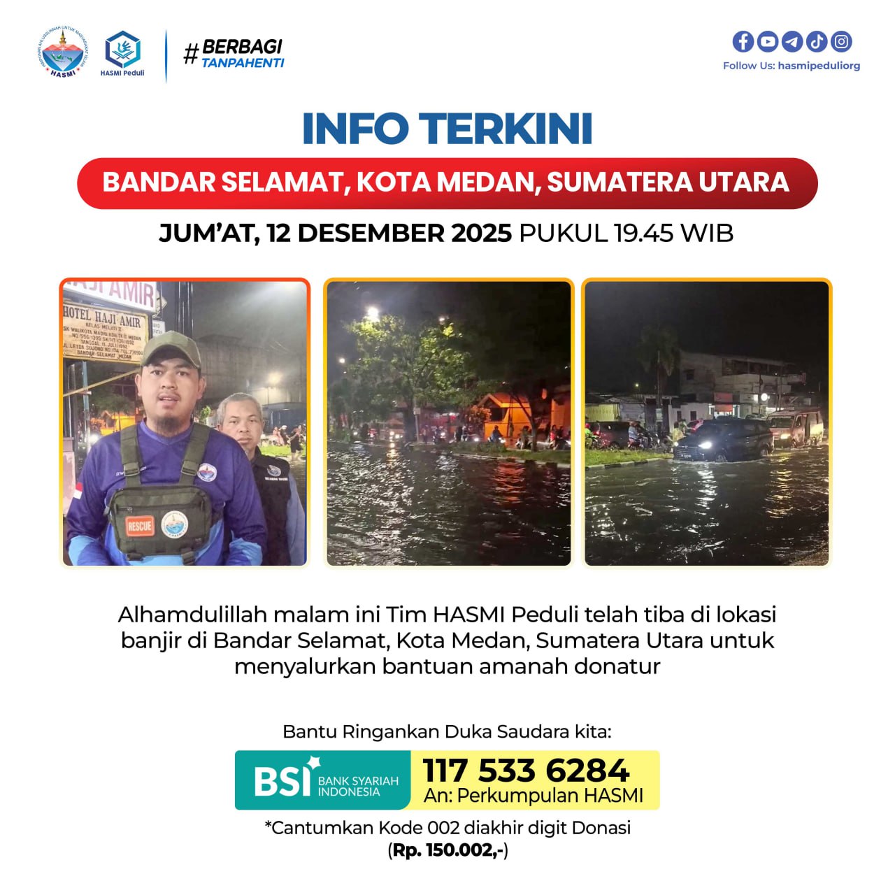 Alhamdulillah, pada Jum’at, 12 Desember 2025 | Pukul 19.45 WIB, relawan HASMI Peduli telah tiba di Bandar Selamat, Medan – Sumatera Utara.