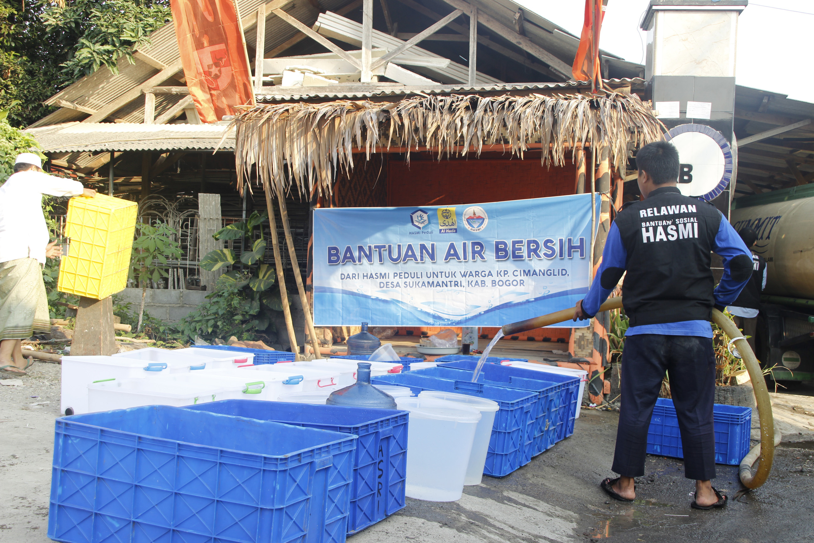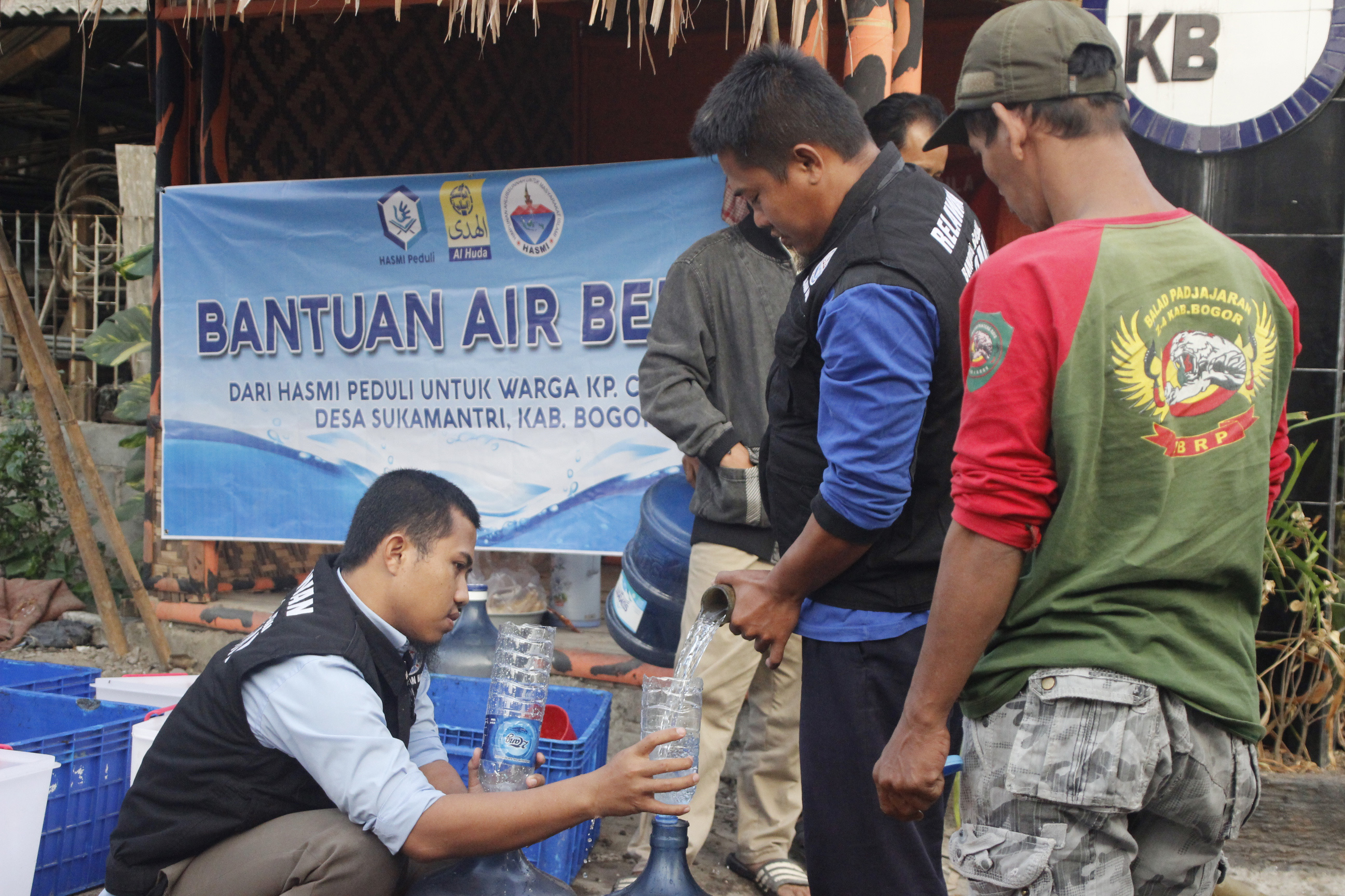 Himpunan Ahlussunnah untuk Masyarakat Islami (HASMI) bagikan air bersih kepada warga Kp. Cimanglid, Desa Sukamantri, Kec. Tamansari, Kab. Bogor pada hari Kamis, 8 Agustus 2019.