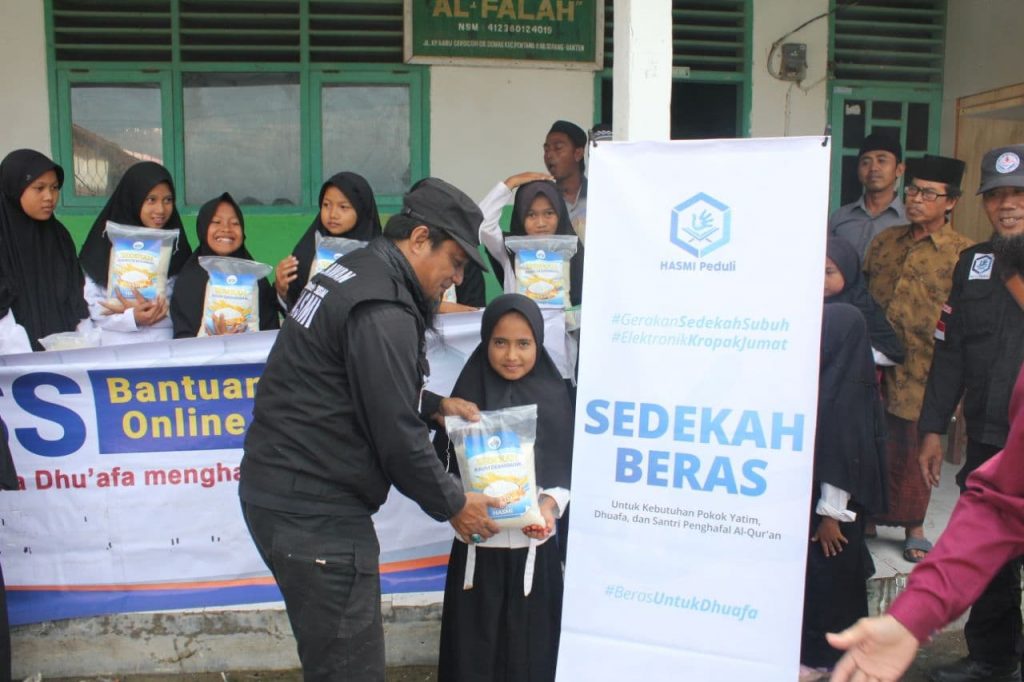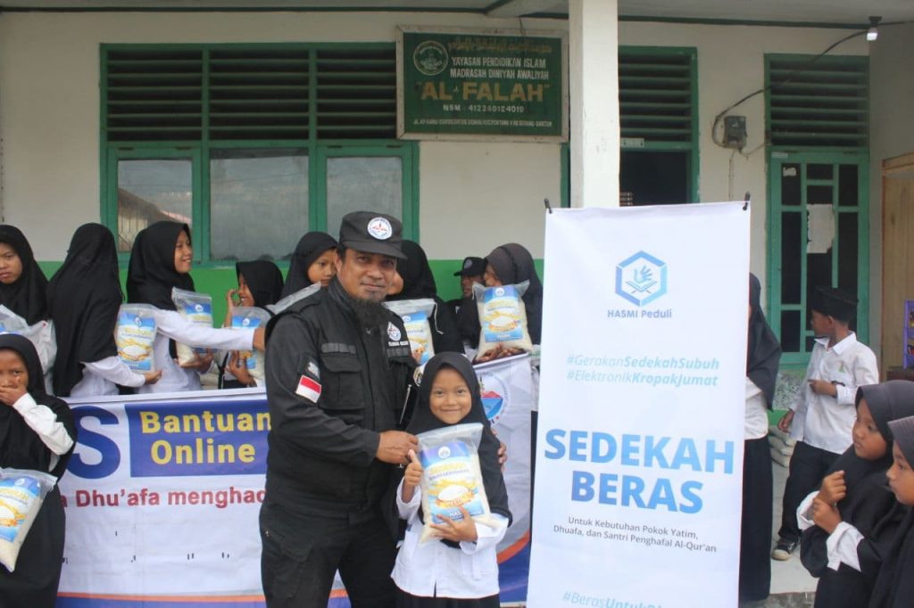 Sebanyak 150 paket bantuan pangan didistribusikan oleh Tim Relawan Sosial HASMI untuk para Santri Madrasah Al Falah di Kp. Cerocoh, Ds. Domas, Kec. Pontang Kab. Serang – Banten
