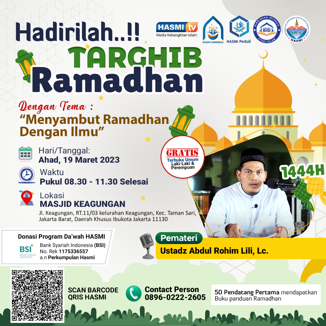 Hadiri & Ikutilah.!! *Targhib Ramadhan* *”Menyambut Ramadhan Dengan Ilmu”* ๐ Ahad, 19 Maret 2023 ๐ Pukul : 08.30 – 11.30 Wib. BOGOR ยน๐ Masjid Salman Al Farisi Jln. Raya Padjajaran, Kompleks PUSLITBANGNAK, Kota Bogor. ๐ Pemateri : Ust. Rohmatulloh, Lc Cp. 0818-414-516 โขโขโข __ Call Center HASMI: 0821-1166-6677 ๐ง Infak Peduli Dakwah HASMI : Bank Syariah Indonesia (Kode: 451) No. …
